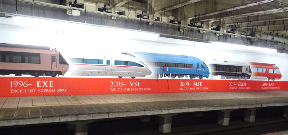 1号車側に来ると、反対側のホームにロマンスカーのラインアップが紹介されているのが見えます。