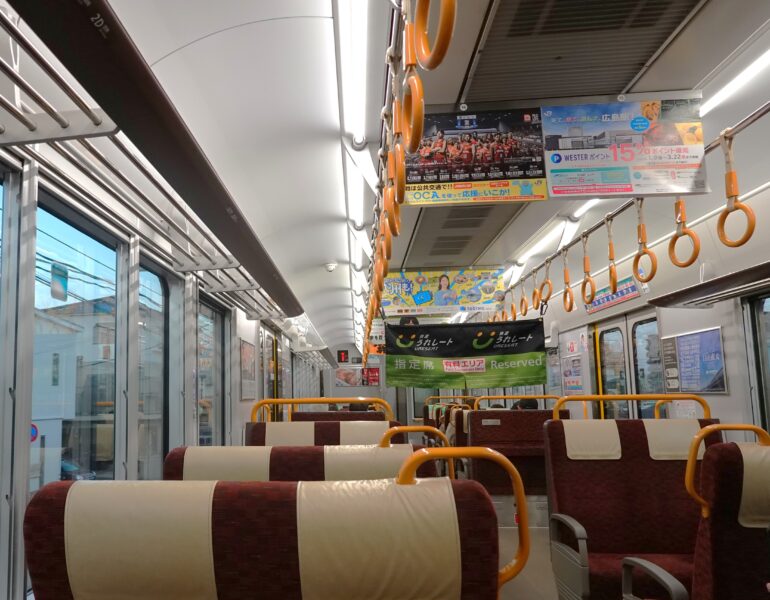 夕方の時間は宮島から広島方面に向かう人が多く、この列車も多く乗車していました。