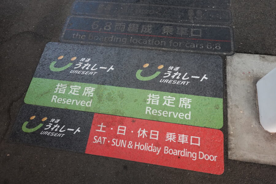 うれしートは指定席ですので、ホーム上に乗車位置案内がしっかりとサインとして作成されてます。