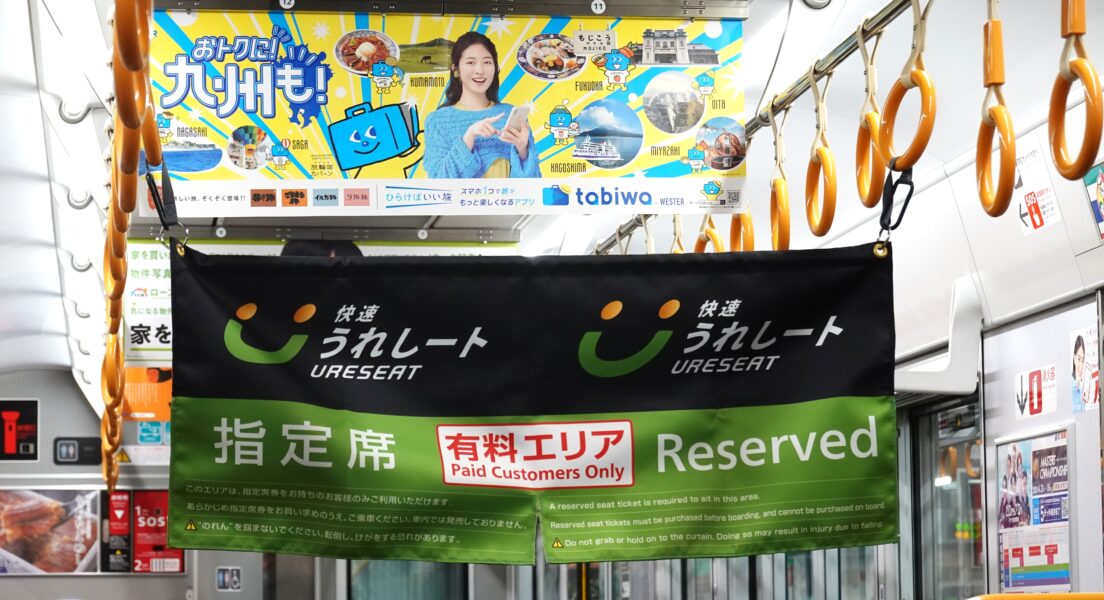 運用開始から2年立っているので情報は知っていましたが、うれしートの案内がつり革に掛けられたのれん1枚 。